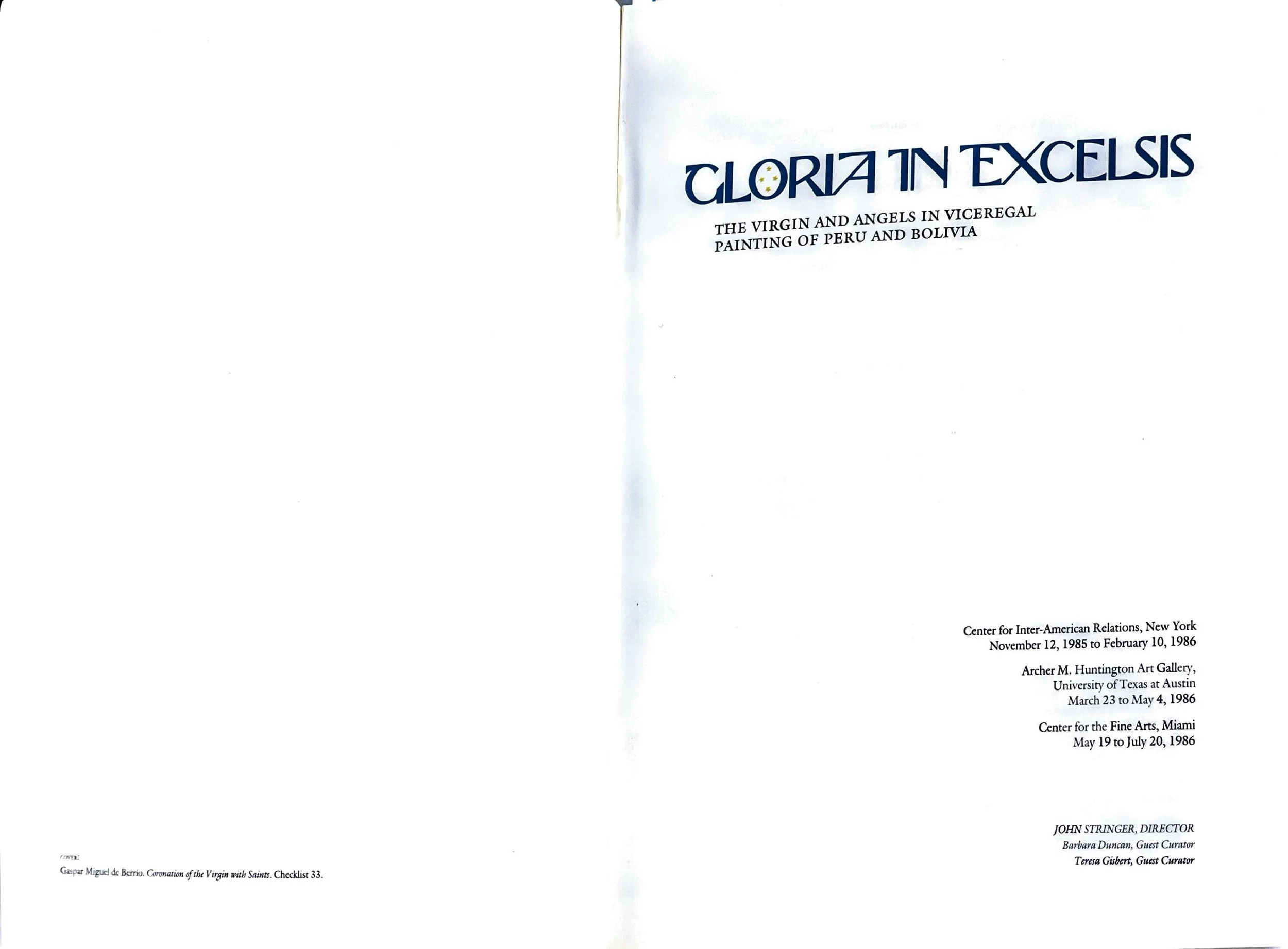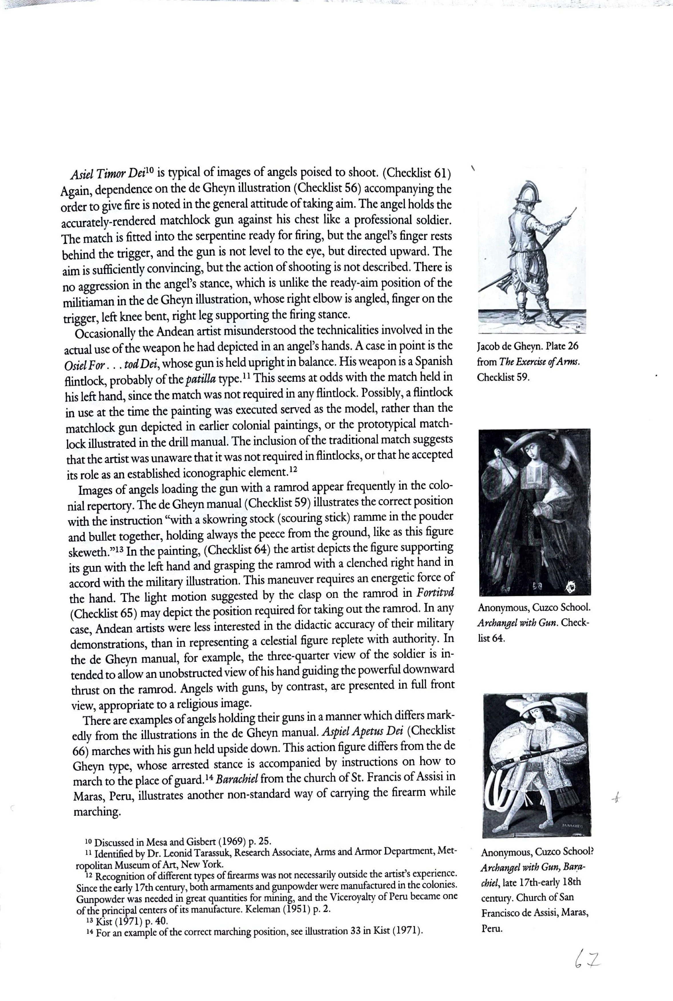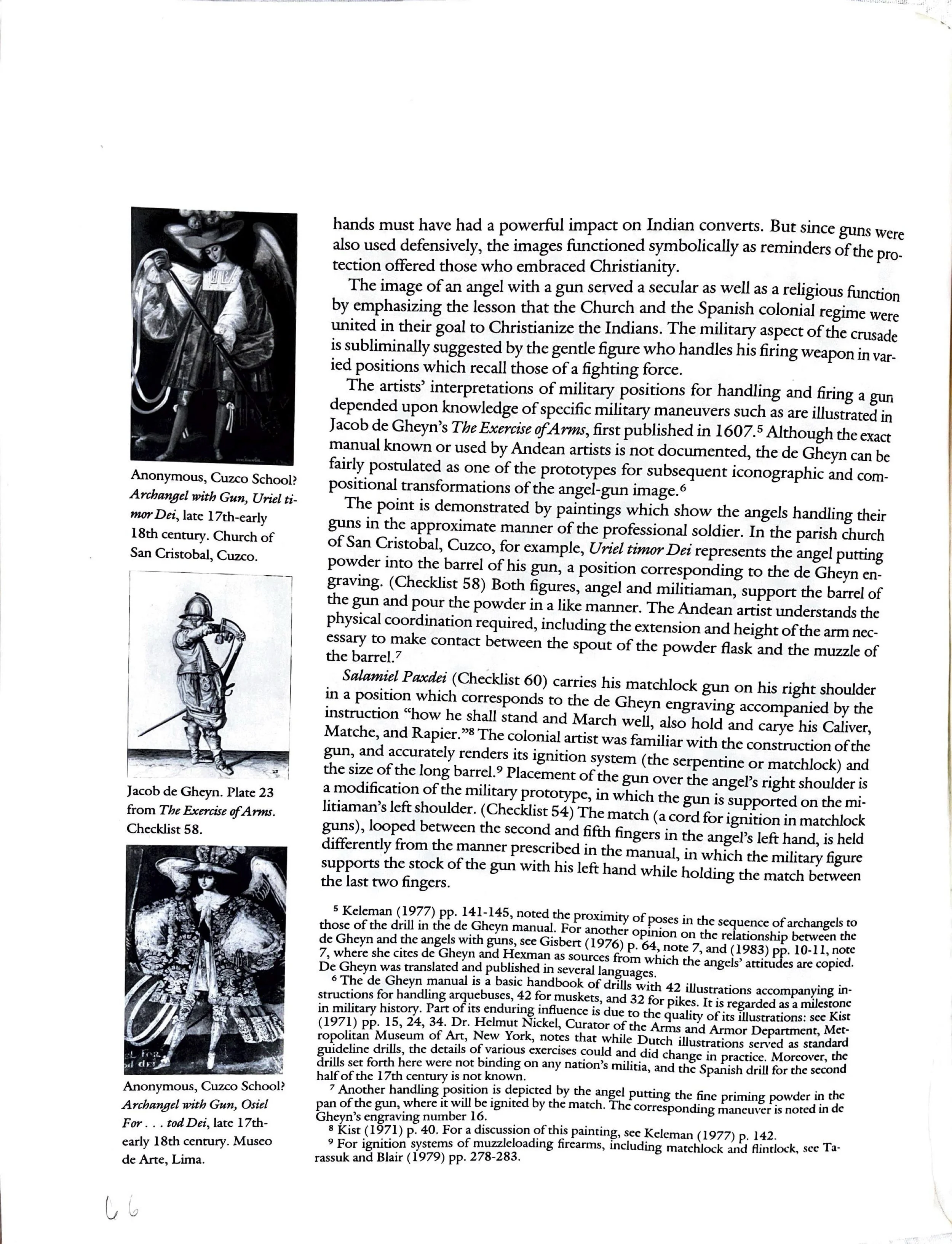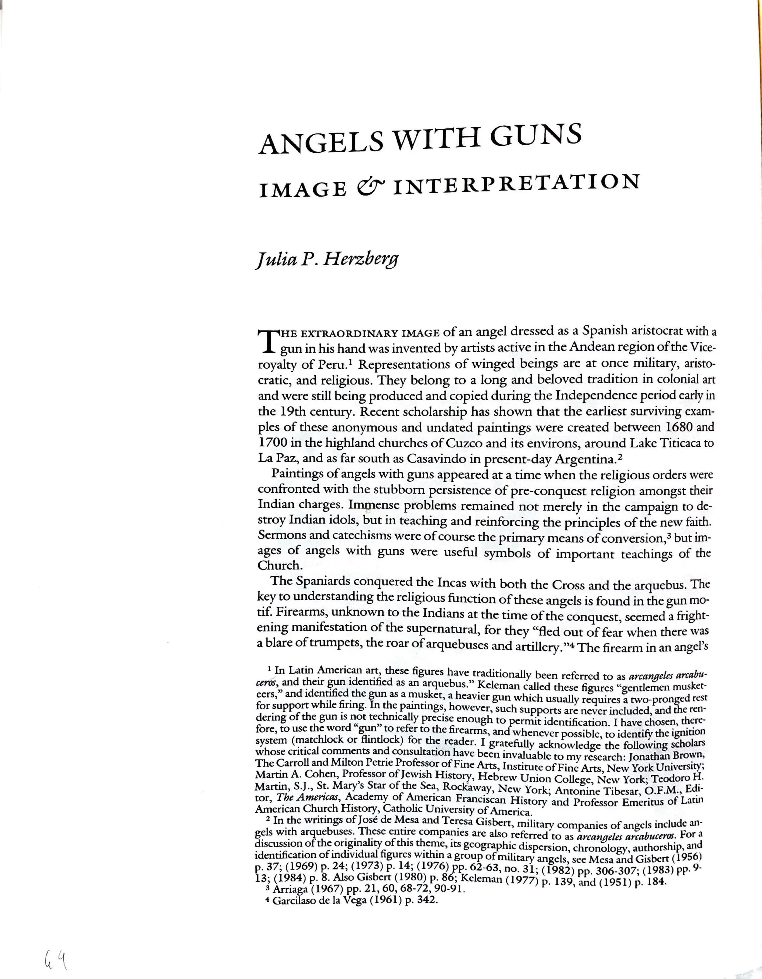 The Herzberg essay on Angels with Guns is here reprinted as it appeared in the Gloria in Excelsis: The Virgin and Angels in Viceregal Painting of Peru and Bolivia catalog, 1986. ISBN 85-073031. ©copyright 1986 Center for Inter-American Relations.