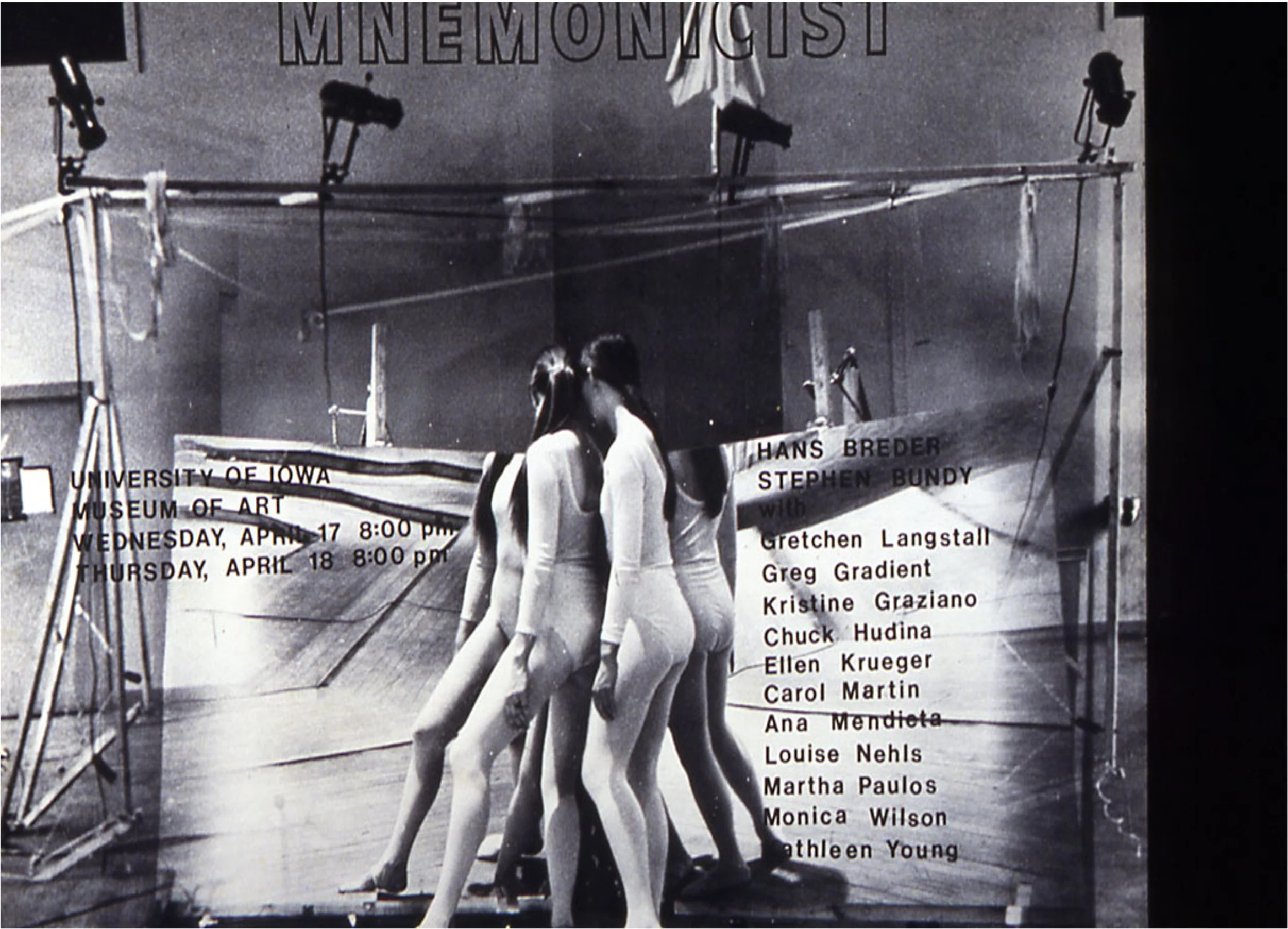 Her work found form and encouragement in the Intermedia Program under Hans Breder, the program’s founder and one of the professors who initiated the Center for New Performing Arts (CNPA). Mendieta is one of the dance performers in Breder’s Mnemonicist, conceived for the CNPA in 1974. Although Mendieta began to take Intermedia classes in 1971 when she was still a graduate painting student, she became aware of Breder’s new ideas for an interdisciplinary arts program in early 1970 when they began a romantic relationship that lasted for ten years. Intermedia emphasized an interdisciplinary approach to art-making, which included an exploration of unconventional materials and supports such as Plexiglas constructions, structured canvases, painted sculptures, light projection on sculptures, and other combinations of materials and surfaces. Breder also emphasized the use of kinetic and environmental elements. Students from different areas in studio art, performing arts (dance, theater, music), writing, and film were encouraged to integrate aspects of their individual disciplines into the development of more conceptual forms of expression. For several years, from 1970 through 1975, the Intermedia Program partnered with the CNPA, which was also officially inaugurated in the fall of 1970. The CNPA developed a singularly innovative interdisciplinary arts program supported by the Rockefeller Foundation. During those five years, avant-garde artists and performers were invited to the university to teach, perform, and lecture on new developments in the arts.