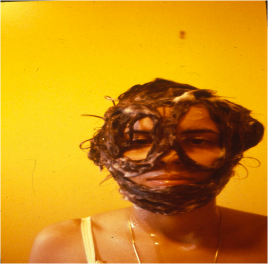 Mendieta’s Facial Cosmetic Variations was among her first performative works documented in the Intermedia studio in spring 1972. One of the artist’s objectives in this series was to perform a piece in which she could re-present her everyday look to get a different sense of self. In this frame Mendieta alters her appearance by forming a weblike mass over her face, and in another her hair is twisted on top of her head. Intermedia students One of the artist’s objectives in this series was to perform a piece in which she could re-present her everyday look to get a different sense of self. In this frame Mendieta alters her appearance by forming a weblike mass over her face, and in another her hair is twisted on top of her head. Intermedia students were discussing the work and ideas ofMarcel Duchamp. Mendieta’s series recalls Man Ray’s Marcel Duchamp with Shaving Lather, a study for Monte Carlo Bond. Facial Cosmetic Variations also calls to mind the later piece, Loving Care by Janine Antoni, a performance in which the artist mopped the gallery floor with her dye-soaked hair, conjuring images of gestural painting, a la Jackson Pollock.