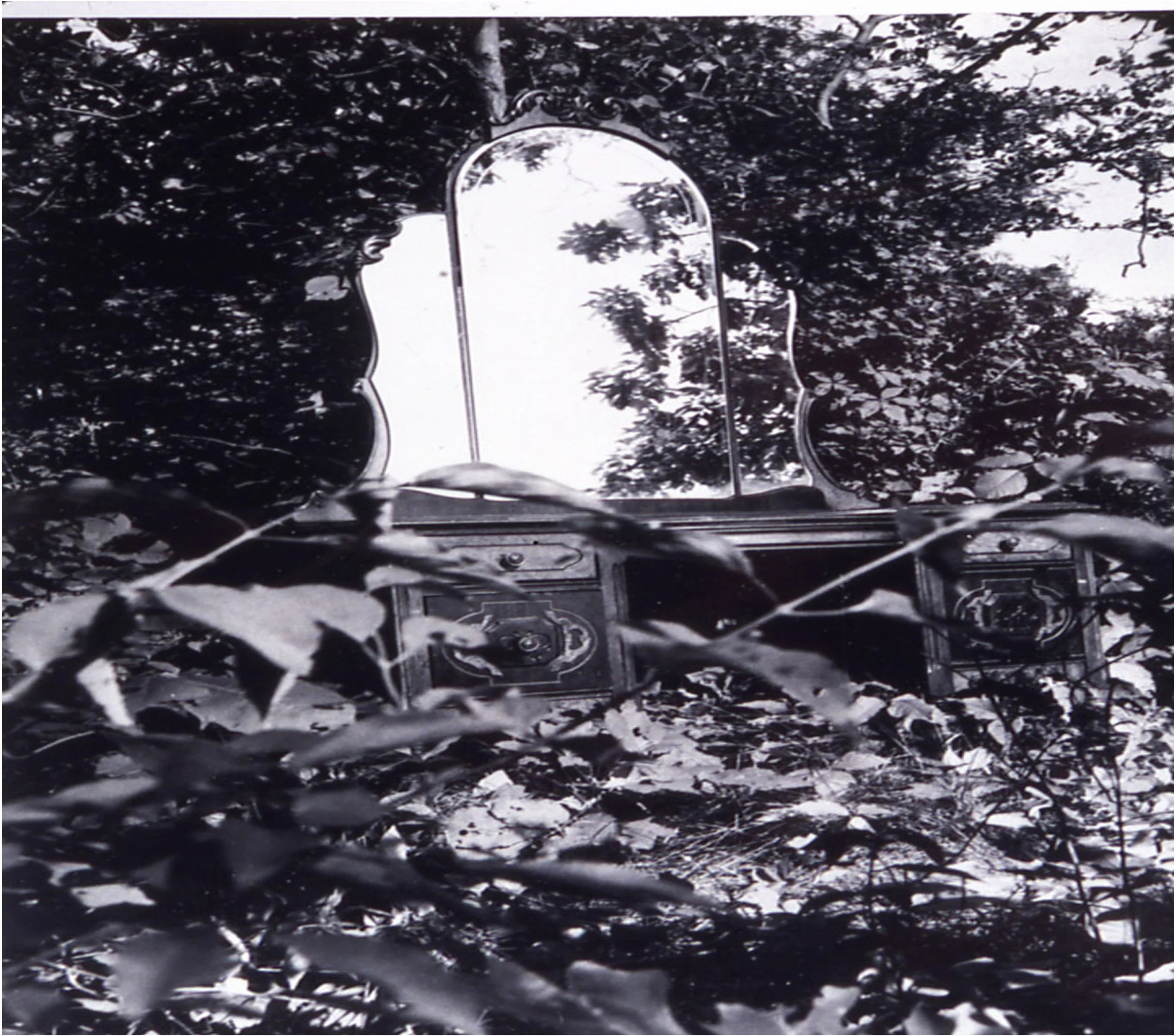 This is Burton’s Furniture Landscape, a three-dimensional sculpture-performance-installation that he presented in a wooded area of the Iowa campus. Truckloads of faculty, students, and Iowa residents went out in the woods to look for the work, which was partially camouflaged by the surrounding vegetation. I think that the hide-and-seek quality of Burton’s work had a lasting effect on Mendieta.