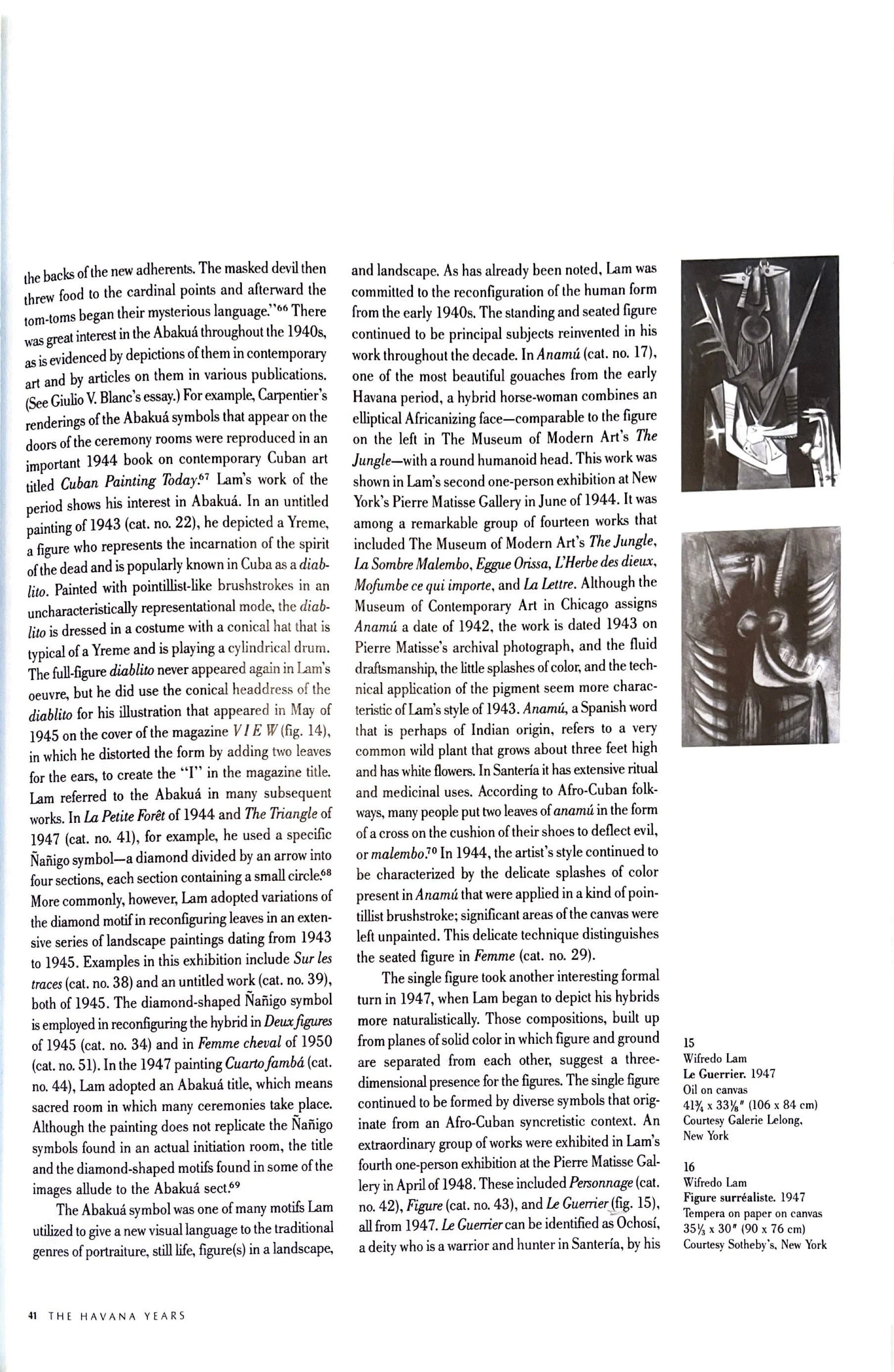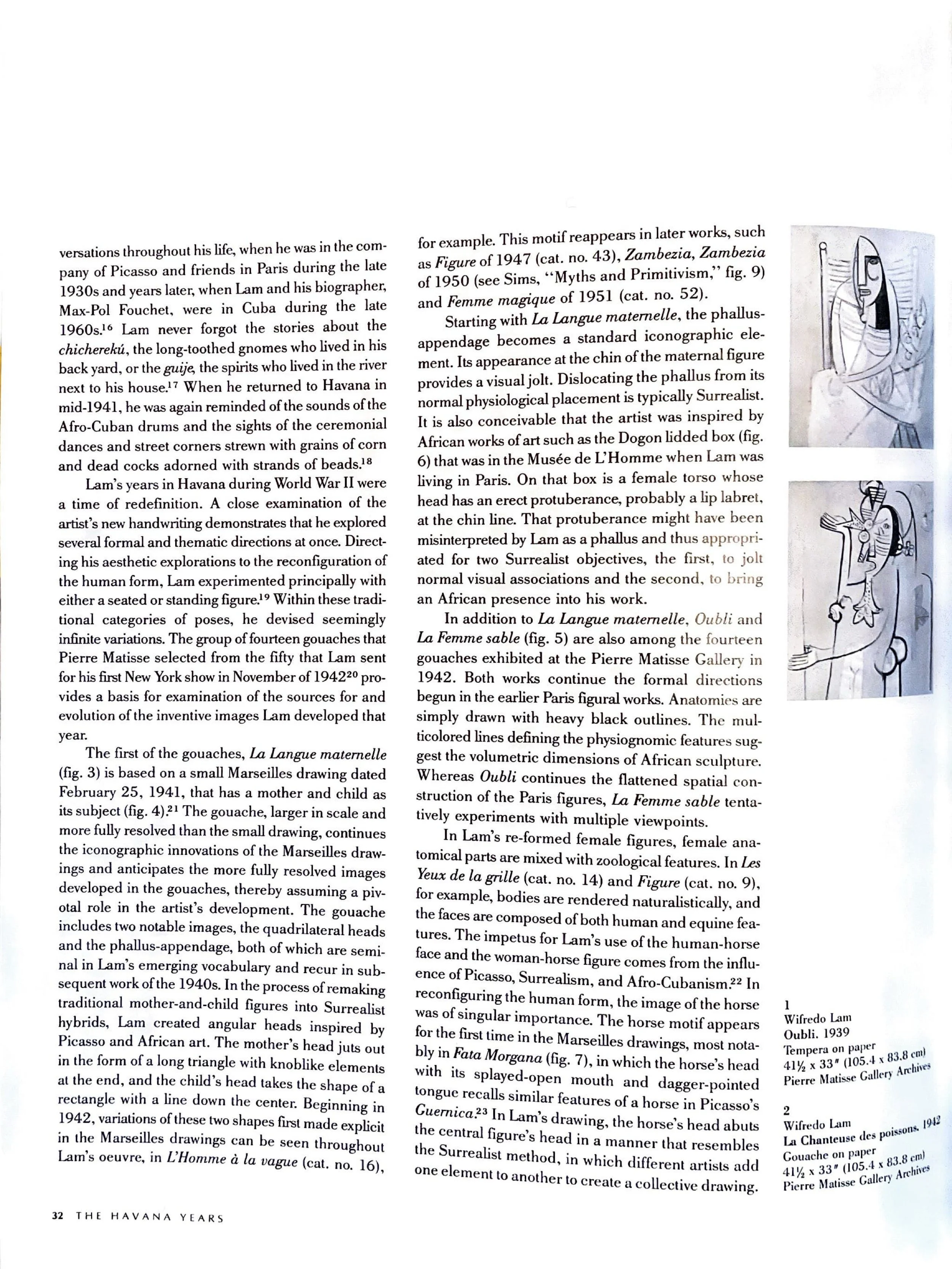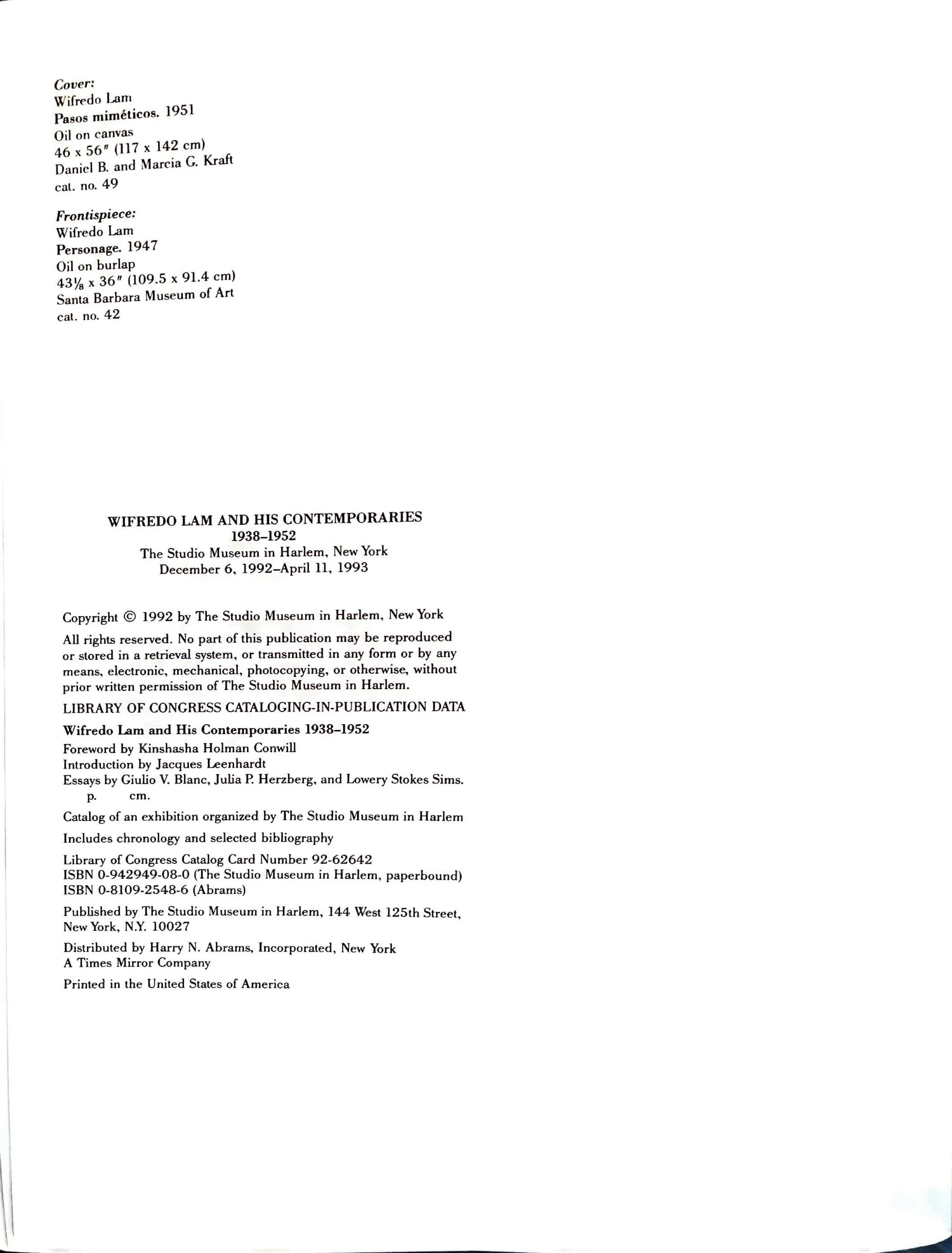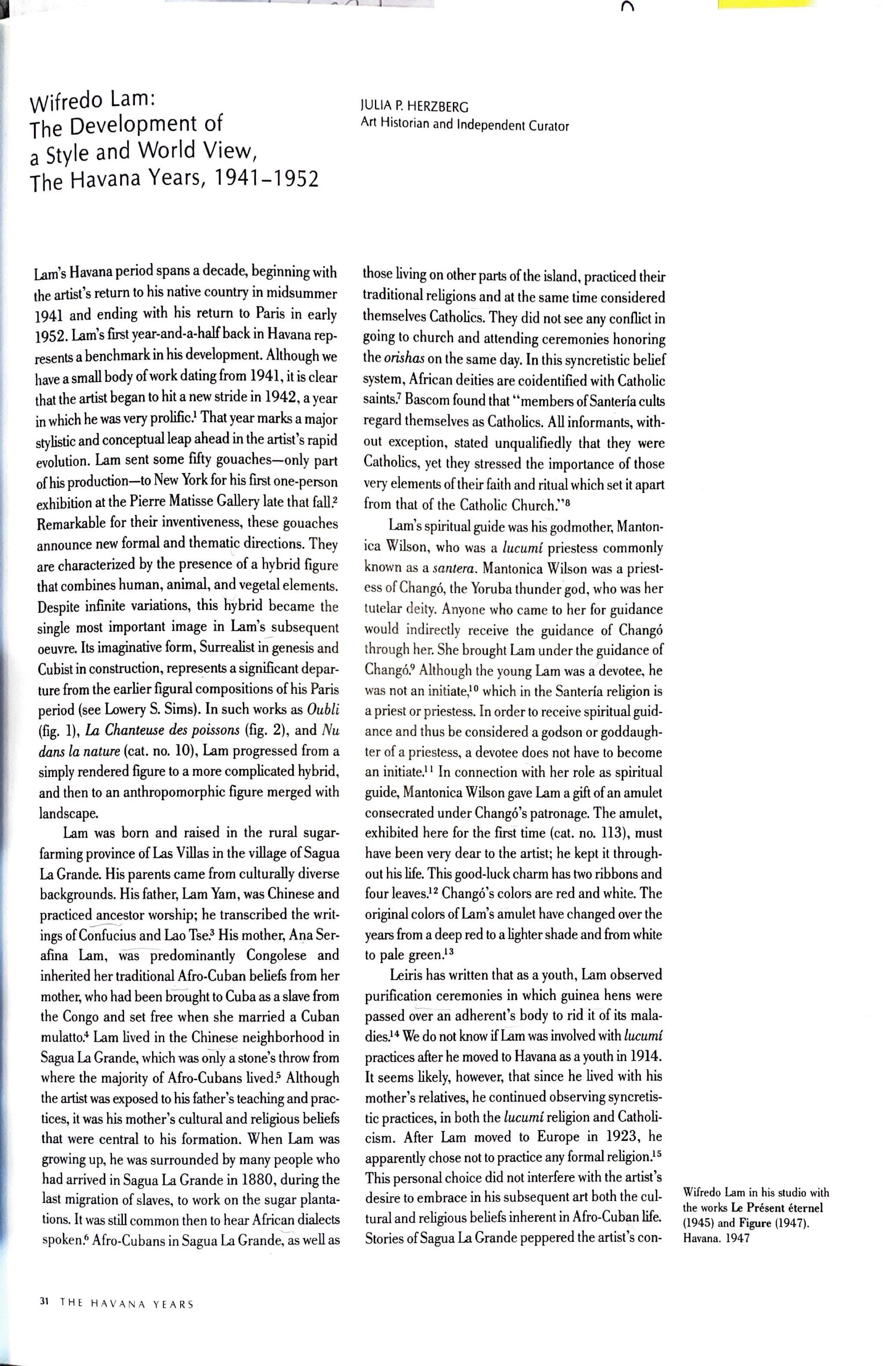 The Herzberg essay, “Wifredo Lam: Development of a Style and Worldview, The Havana Years 1941-1952” is here reprinted as it appeared in "Wifredo Lam: Development of a Style and Worldview, The Havana Years 1941-1952." Wifredo Lam and His Contemporaries. New York: The Studio Museum in Harlem, 1992 (pp. 30-51; co-essayists Lowery Stokes Sims, Giulio V. Blanc) ISBN 0-942949-08-0
